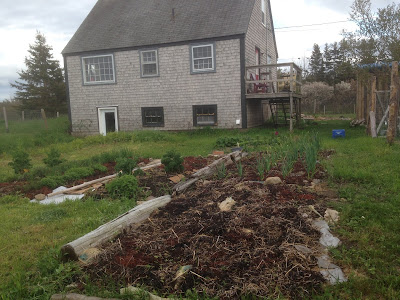 Lots of new gardens being prepped. There are some dahlias and some glads in them already, where the hay cover is, and some day lilies that were given to us by a neighbour. We're going to remove the cardboard soon, just keeping it covered for now so the weeds don't spring up before we've planted what we want in there.